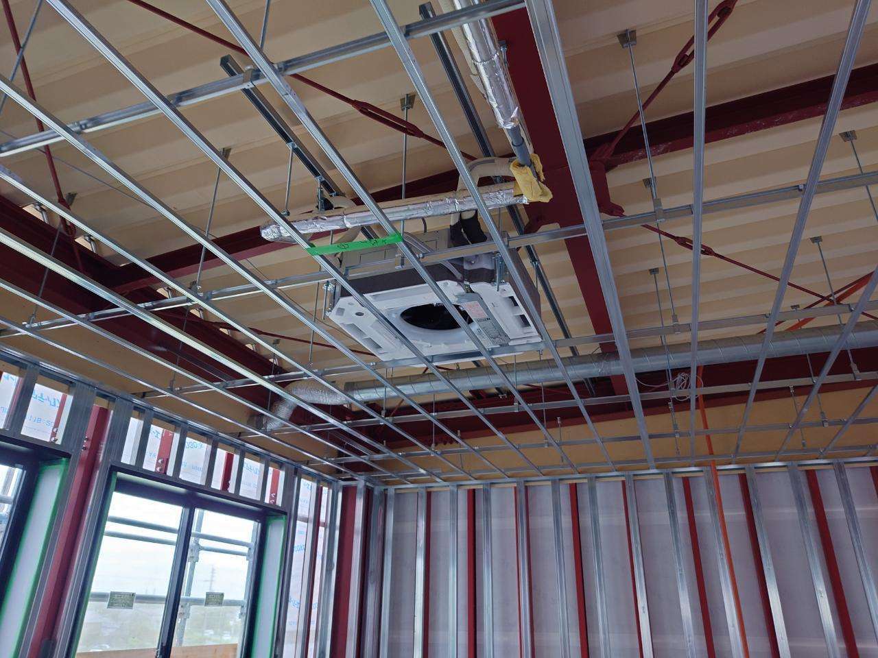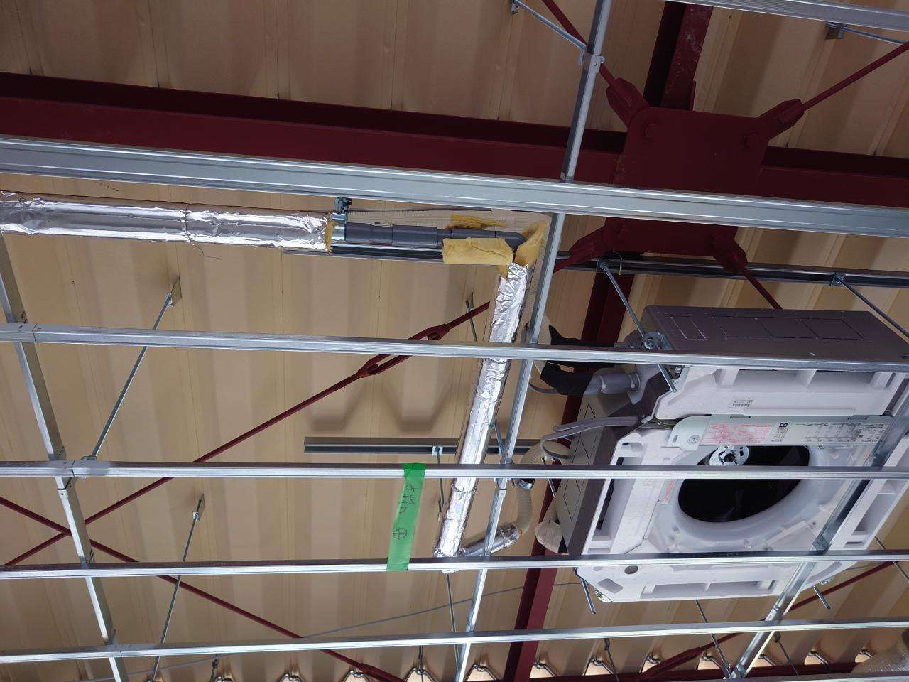 今回は、内装工事が始まる前のスケルトン状態の天井に、カセット形エアコン本体の吊り込みと先行配管工事を実施しました。この段階で施工することで、配管を天井裏に美しく隠蔽でき、仕上がりの品質が格段に向上します。
